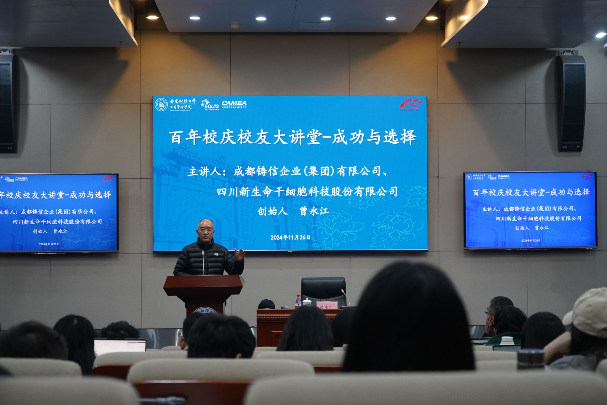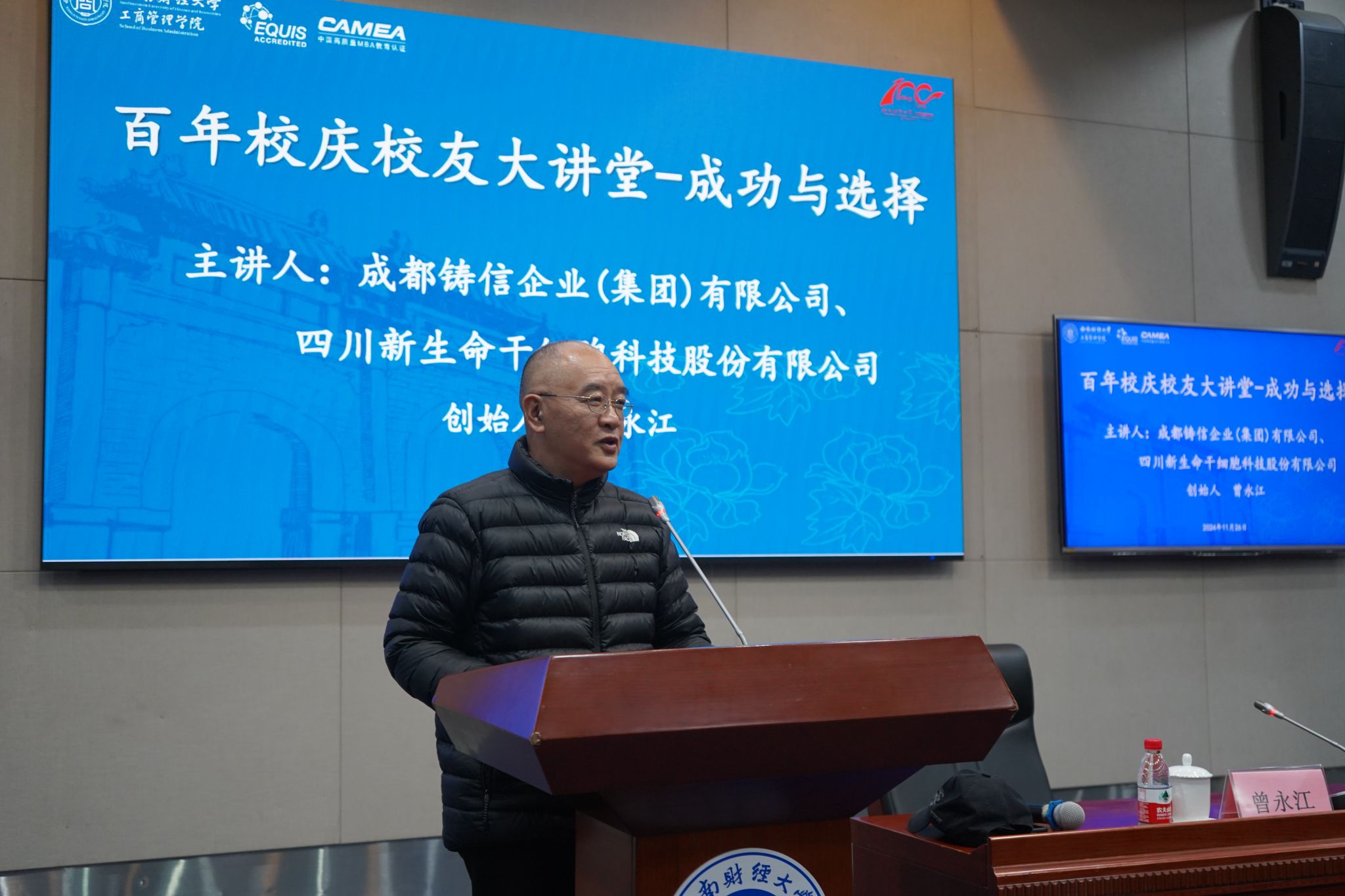 11月26日下午,“百年校庆校友大讲堂”主题讲座《成功与选择》在弘远楼101会议室成功举行。我院杰出校友代表,1992级硕士、2003级博士,四川省优秀企业家、深圳市优秀企业家,成都铸信企业(集团)有限公司、四川新生命干细胞科技股份有限公司创始人曾永江作为主讲嘉宾。学院党委书记郑茂、院长李涵,学院师生代表200余人参加讲座。李涵主持本次讲座。