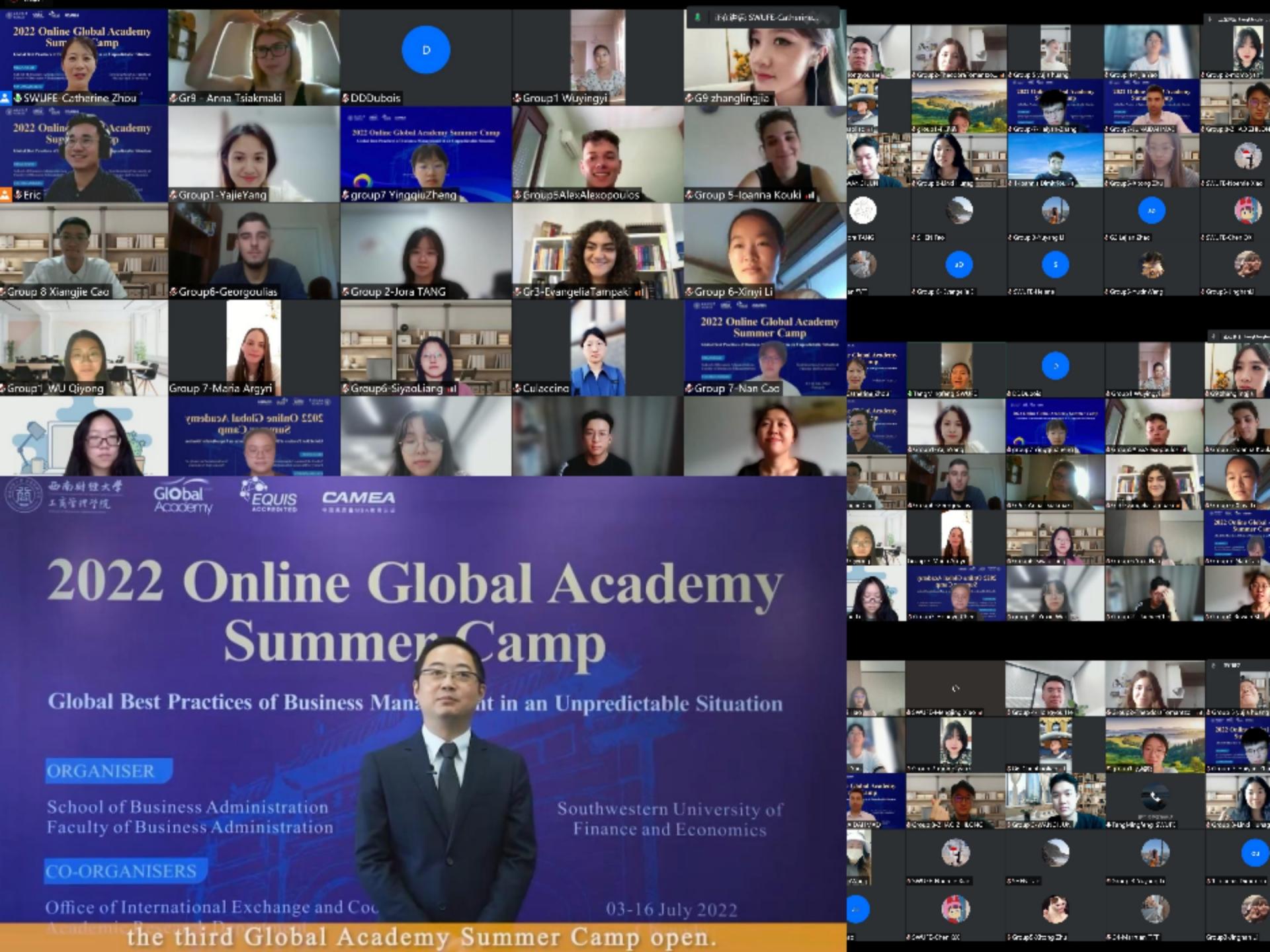 The 2022 Global Academy Summer Camp was hosted virtually by the School of Business Administration (SBA), Faculty of Business Administration (FBA), Southwestern University of Finance and Economics (SWUFE), and co-organized by the Office of International Exchange and Cooperation (Office of Hong Kong, Macao and Taiwan Affairs) and the Academic Research Department of SWUFE. It officially started on 4 July and lasted for two weeks, attracting more than 60 students from China, Germany, Greece, South Korea, Mongolia, Morocco, Pakistan and Russia. Professor Jue Wang, Executive Dean of SBA SWUFE, expressed his warm welcome to all the participants and introduced SBA, as well as SWUFE and the previous Global Academy Summer Camps in his opening speech.