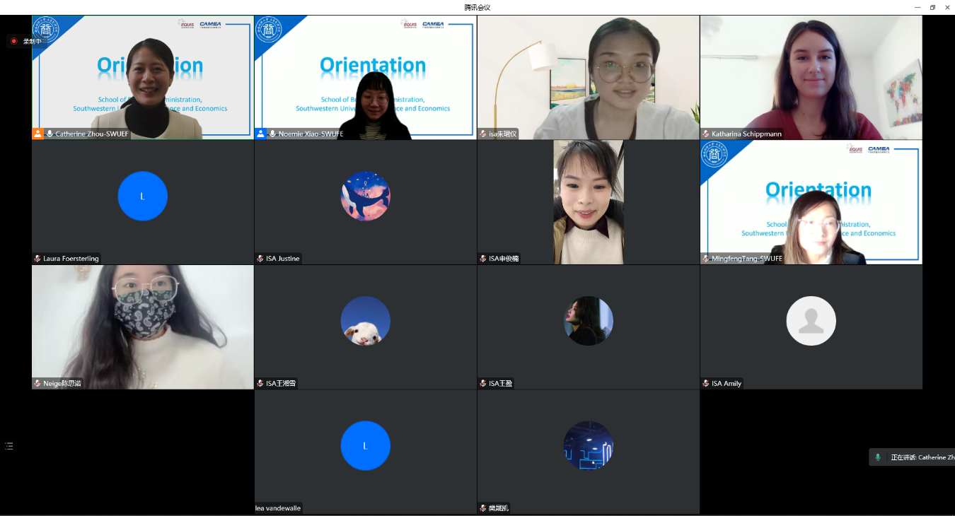 On February 19, the Spring Semester 2023 Orientation for incoming students of School of Business Administration (SBA), Southwestern University of Finance and Economics (SWUFE) was successfully held online. Professor Mingfeng Tang, Assistant Dean in charge of International Affairs of SBA, Ms. Noemie Xiao and Ms. Catherine Zhou from International Affairs Office of SBA, volunteers from the International Student Association (ISA) of SBA, and all new incoming students from partner universities attended the meeting.